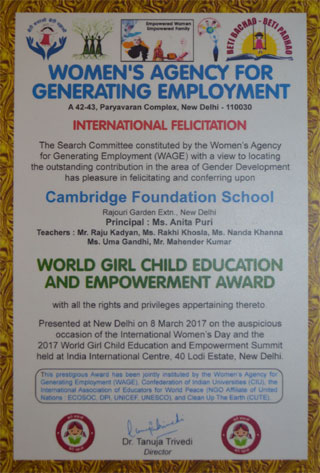 On the occasion of the International Women’s Day, 8th March, 2017, WAGE (Women’s Agency for Generating Employment) presented the WORLD GIRL CHILD EDUCATION AND EMPOWERMENT AWARD to our School with a view to motivating the students and teachers for promoting required skills among the students, especially in the area of cleaning, greening and environment.