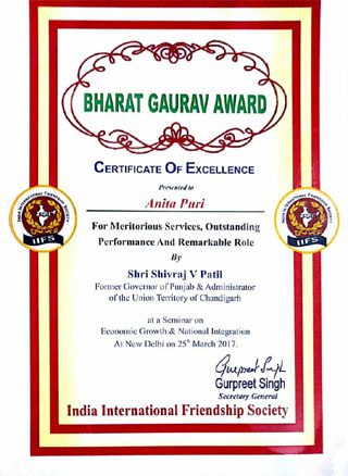 Principal, Ms. Anita Puri, was felicitated with the coveted institutional and globally reputed “Bharat Gaurav Award” by the India International Friendship Society for her outstanding services, achievements and contributions in the field of education on 25th March 2017 at an august ceremony held at India International Centre, New Delhi. She received the award from Shri Shivraj V. Patil, Former Governor of Punjab and Administrator of the Union Territory of Chandigarh.