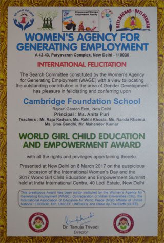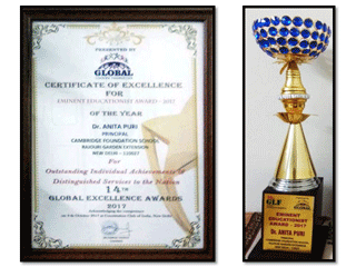 Dr. Anita Puri, Principal, Cambridge Foundation School was conferred with the “Eminent Educationist Award” for Outstanding Individual Achievements and Distinguished Services to the Nation at the 14th Global Excellence Awards and Green Ambassadors Summit organised by the Global Leaders Foundation at the Constitution Club of India, Rafi Marg, New Delhi on 4th October, 2017. The award was presented by the Chief Guest, Sh. Balmiki Prasad Singh, former Governor of Sikkim and Sh. Sandeep Marwah – A renowned International Media Personality. On behalf of the school, the ceremony was attended by Ms. Seema Punhani.