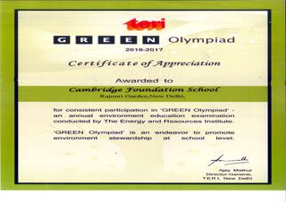 The Energy and Resources Institute (TERI) acknowledged the endeavour in promoting a clean and green environment by consistently participating in the Green Environment Olympiad by presenting the School with a Certificate of Appreciation.